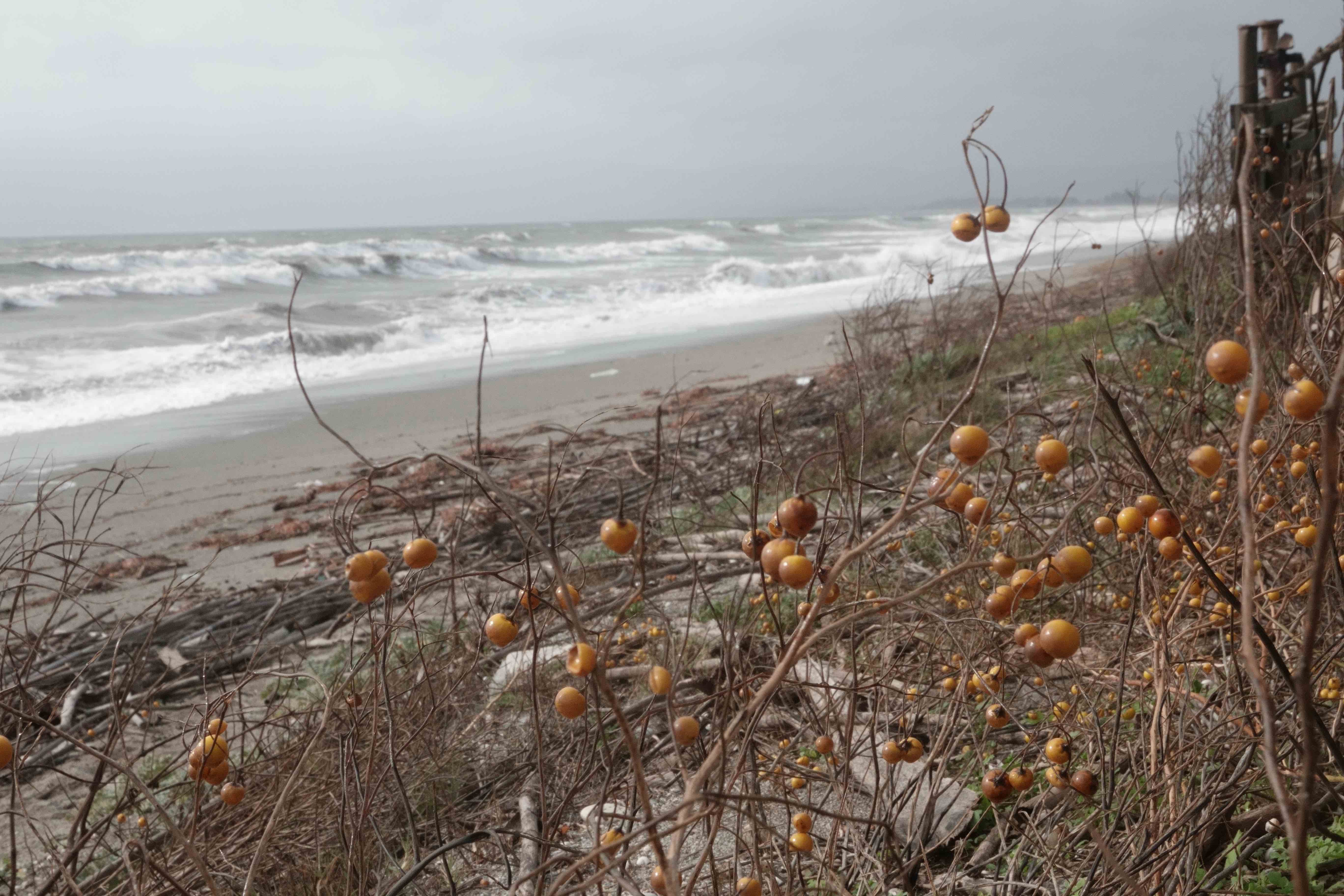 Besonders auffallend sind die Früchte des Silberblättrigen Nachtschattens, obwohl es sich um eher kleine Beeren handelt: Kugelig, 1-1,5 Zentimeter im Durchmesser, zunächst grün mit Streifen, bei Reife glänzend gelb oder gelborange, und sehr lange an den Pflanzen haftend: Vor allem im Winter leuchten einem die kleinen Früchte schon von Weitem entgegen, sei es an den in dieser Jahreszeit meist verlassenen Stränden, brach liegendem Ackerland oder anderen, ungenutzten Arealen mit sandig-durchlässigen Böden in sonniger Lage. Die perlenartigen Beeren machen die in dieser Jahreszeit nun weitgehend blattlose Pflanze seltsam attraktiv – kleine, gelbbunte Kugeln in großer Zahl in einem sonst eher graugrünen Umfeld.
