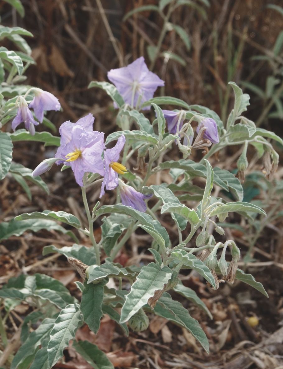 Es geht um den Silberblättrigen Nachtschatten (Solanum elaeagnifolium), der wegen der Form seiner Laubblätter in manchen Publikationen auch Ölweidenblättriger Nachtschatten genannt wird. Diese Pflanzenart ist nach derzeitigem Stand der Botanik zwar nur eine von über 1200 Arten der Gattung Nachtschatten, aber es ist offenbar eine besonders konkurrenzstarke und ausbreitungswillige Art: Ursprünglich in Amerika beheimatet (südwestliche USA, Texas und Mexiko sowie Chile, Argentinien, Paraguay und Uruguay) hat der Silberblättrige Nachtschatten vor einigen Jahrzehnten seinen Weg nach Afrika, Europa, Asien und Australien gefunden. Heute begegnen wir dieser bemerkenswerten Pflanze vor allem in Ägypten, Israel, Südafrika, Simbabwe, Marokko und Spanien, Süditalien und Sizilien, Indien und – Griechenland. Hier, in Griechenland, tauchten die ersten Bestände um 1940 auf, zunächst auf die Umgebung weniger Hafenorte beschränkt. Seit wenigen Jahrzehnten lässt sich allerdings eine zunehmend rasche Ausbreitung der Pflanze feststellen, und heute bildet sie einen festen und nicht mehr zu übersehenden Bestandteil vieler Brachflächen, Weg- und Ackerränder. Hat man sie erst einmal kennengelernt, fällt sie einem später rasch auf – sowohl während der langen Blütezeit im Sommer als auch im Winterhalbjahr, wenn an den Stängeln nur noch die Früchte verblieben sind.