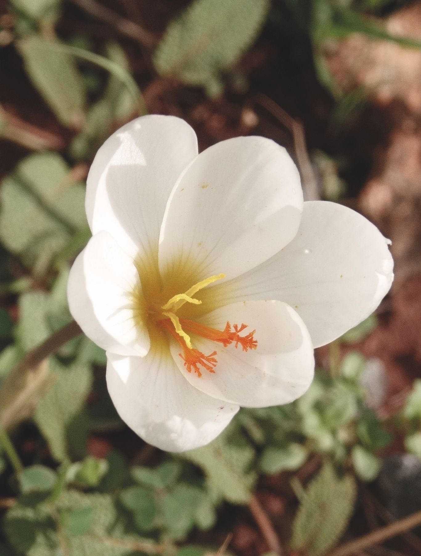 Während die Kretische Schwertlilie (Iris unguicularis) an vielen Stellen Südgriechenlands vom Spätherbst bis ins nächste Jahr hinein meist ausdauernd blüht, wird die Blüte eines anderen Schwertliliengewächses vor allem bei regnerischem Wetter meist rasch beendet: Der fast schneeweiße, im Spätherbst blühende Boryi-Krokus (Crocus boryi) zeigt seine Blütenpracht nur bei trockenem und noch besser bei sonnigem Wetter, und das sollte dann gleich ein paar Wochen anhalten. Was schon auf eine rasche Vergänglichkeit verweist, die zumindest einem antiken Mythos nach für die Herkunft dieser kleinen Pflanze steht. Davon später mehr.