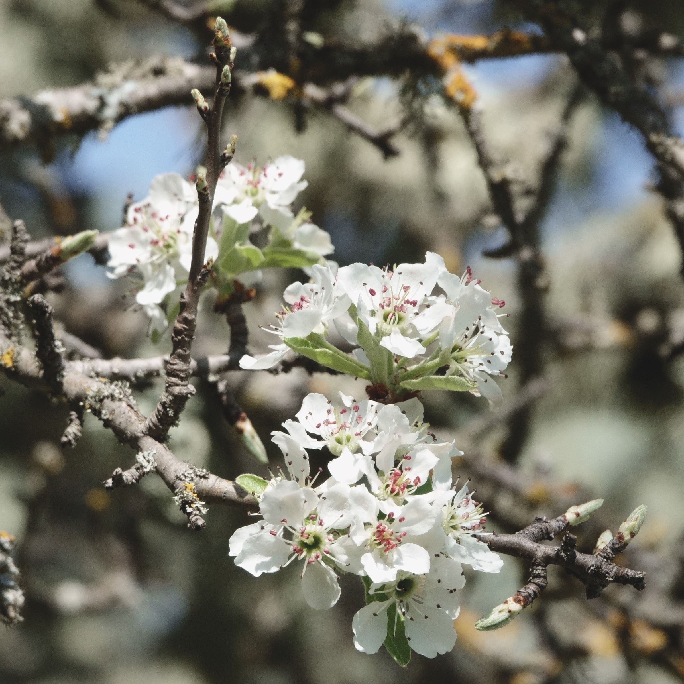 Die leuchtend weißen Blüten stehen zu 3-9 in Doldentrauben an Kurztrieben. Die einzelne Blüte ist zwittrig, radiärsymmetrisch und fünfzählig, etwa 3 Zentimeter breit, mit auffällig großen und zur Fruchtzeit bleibenden Kelchblättern. Die Ähnlichkeit mit Blüten anderer Rosengewächse – denn zu dieser Familie gehört auch die Birne – ist unübersehbar.